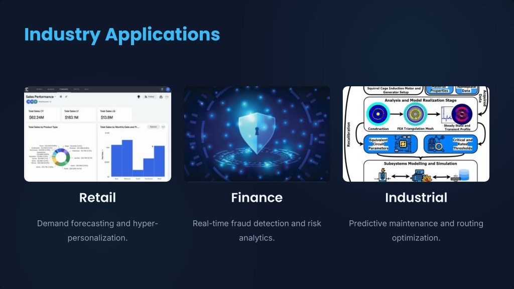 6. Industry Applications Retail Finance Industrial Demand forecasting and hyper-personalization. Real-time fraud detection and risk analytics. Predictive maintenance and routing optimization.