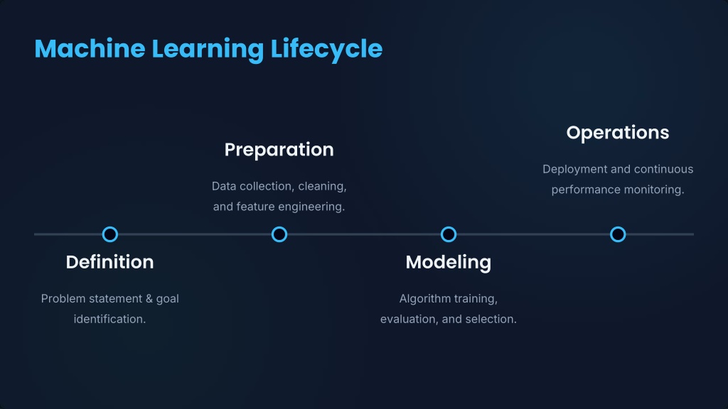 4. Machine Learning Lifecycle Operations Preparation Deployment and continuous performance monitoring. Data collection, cleaning, and feature engineering. Definition Modeling Problem statement & goal identification. Algorithm training, evaluation, and selection.