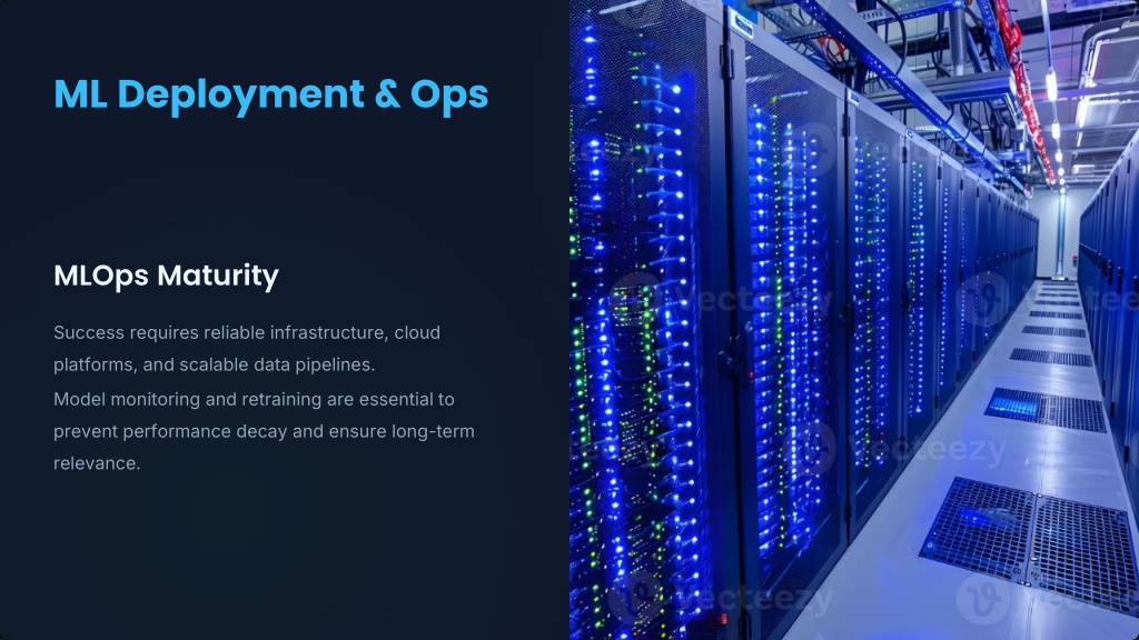 7. ML Deployment & Ops MLOps Maturity Success requires reliable infrastructure, cloud platforms, and scalable data pipelines. Model monitoring and retraining are essential to prevent performance decay and ensure long-term relevance.