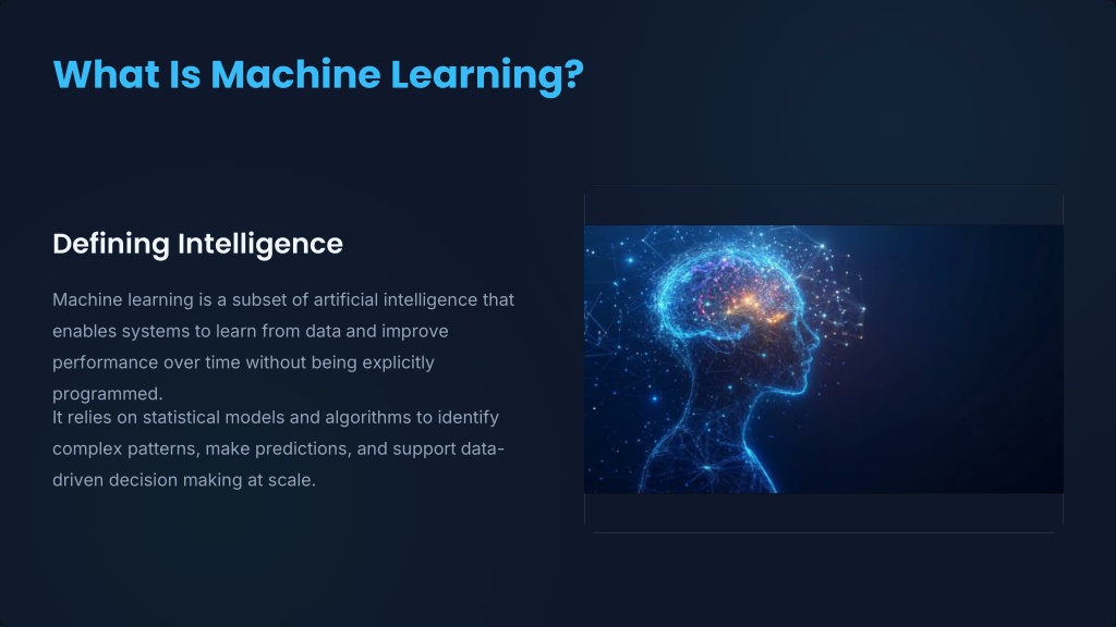 2. What Is Machine Learning? Defining Intelligence Machine learning is a subset of artificial intelligence that enables systems to learn from data and improve performance over time without being explicitly programmed. It relies on statistical models and algorithms to identify complex patterns, make predictions, and support data-driven decision making at scale.