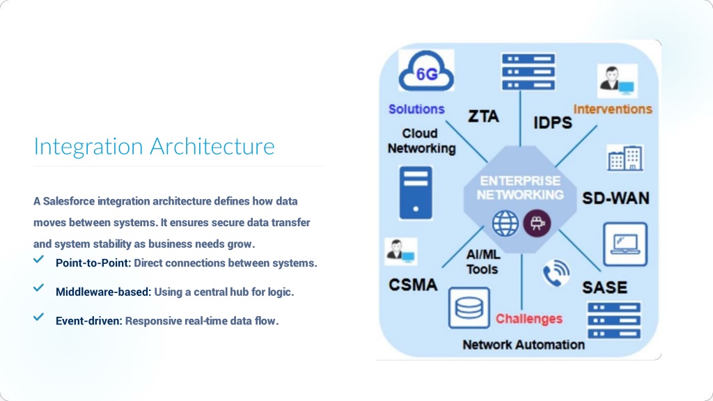 Integration Architecture A Salesforce integration architecture defines how data moves between systems. It ensures secure data transfer and system stability as business needs grow. Point-to-Point: Direct connections between systems. Middleware-based: Using a central hub for logic. Event-driven: Responsive real-time data flow.