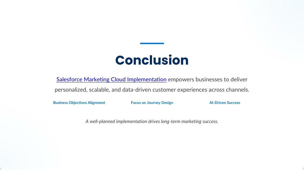 10. Conclusion Salesforce Marketing Cloud Implementation empowers businesses to deliver personalized, scalable, and data-driven customer experiences across channels. Business Objectives Alignment Focus on Journey Design AI-Driven Success A well-planned implementation drives long-term marketing success.
