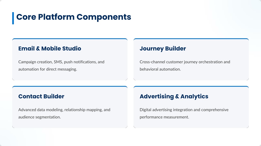 4. Core Platform Components Email & Mobile Studio Journey Builder Campaign creation, SMS, push notifications, and automation for direct messaging. Cross-channel customer journey orchestration and behavioral automation. Contact Builder Advertising & Analytics Advanced data modeling, relationship mapping, and audience segmentation. Digital advertising integration and comprehensive performance measurement.