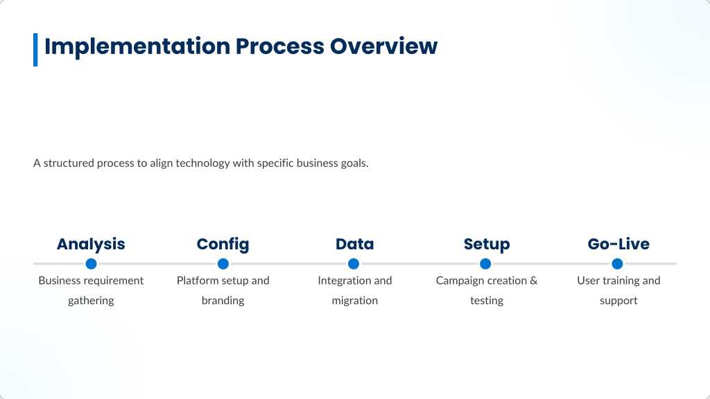 5. Implementation Process Overview A structured process to align technology with specific business goals. Analysis Config Data Setup Go-Live Business requirement gathering Platform setup and branding Integration and migration Campaign creation & testing User training and support