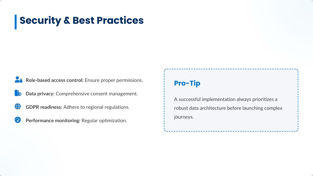 9. Security & Best Practices Role-based access control: Ensure proper permissions. Pro-Tip Data privacy: Comprehensive consent management. A successful implementation always prioritizes a robust data architecture before launching complex journeys. GDPR readiness: Adhere to regional regulations. Performance monitoring: Regular optimization.
