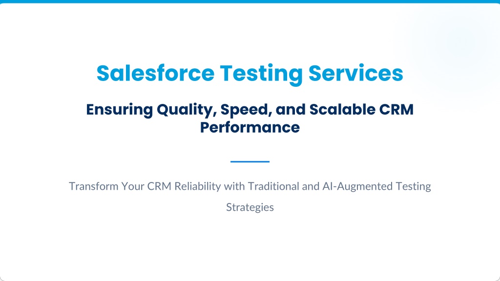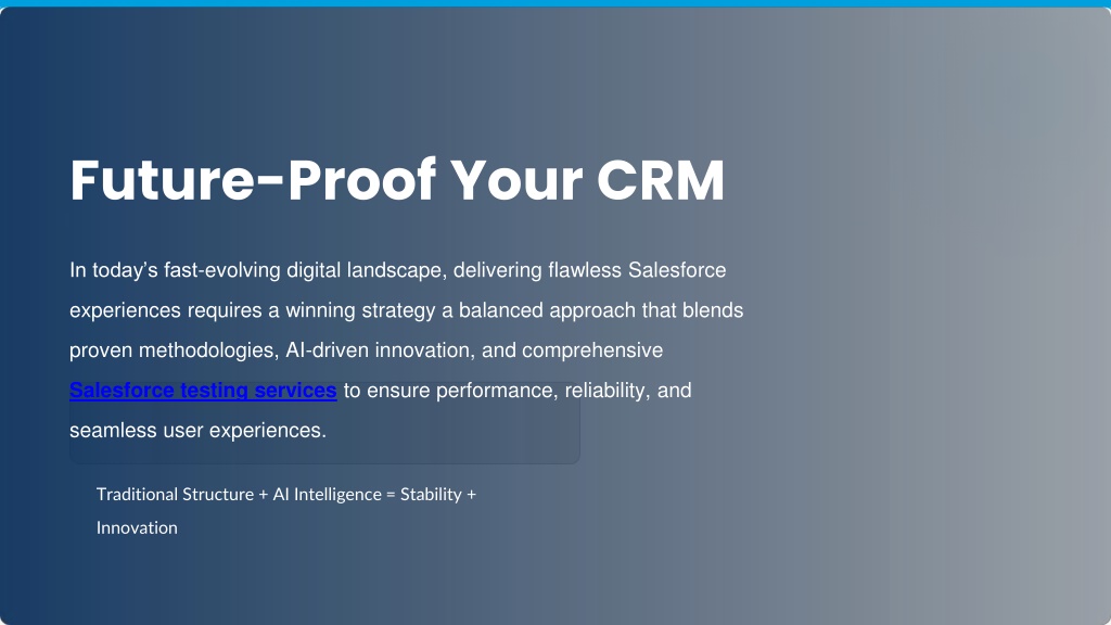 Future-Proof Your CRM In today’s fast-evolving digital landscape, delivering flawless Salesforce experiences requires a winning strategy a balanced approach that blends proven methodologies, AI-driven innovation, and comprehensive Salesforce testing services to ensure performance, reliability, and seamless user experiences. Traditional Structure + AI Intelligence = Stability + Innovation