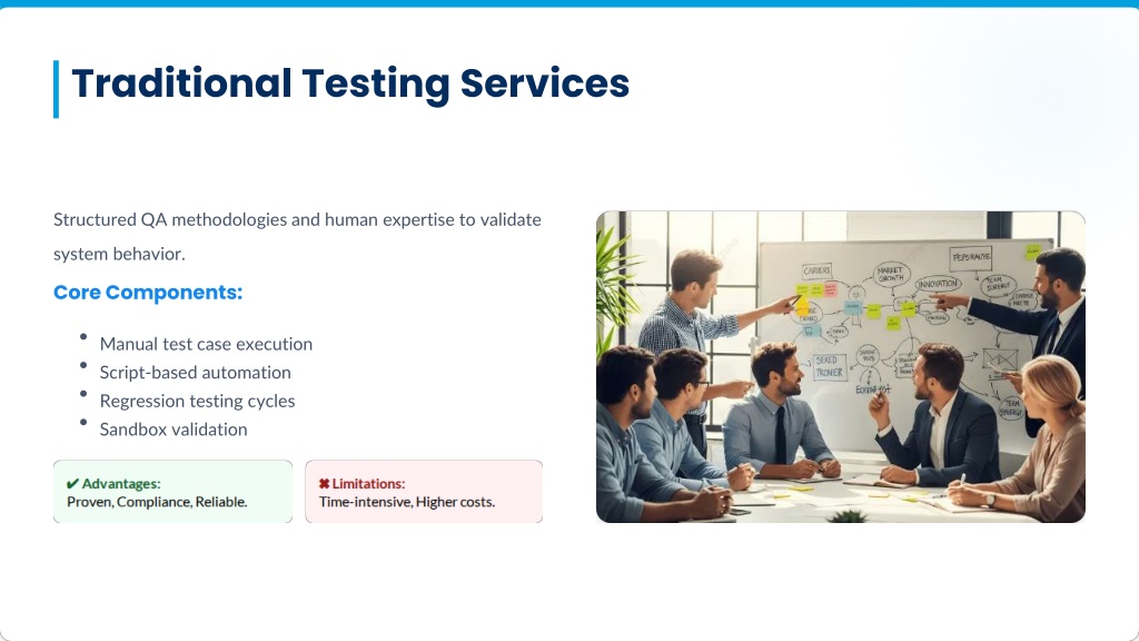 Traditional Testing Services Structured QA methodologies and human expertise to validate system behavior. Core Components: • Manual test case execution • Script-based automation • Regression testing cycles • Sandbox validation
