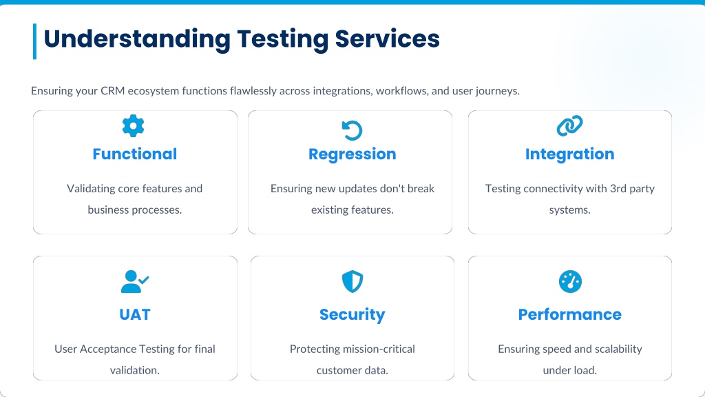 Understanding Testing Services Ensuring your CRM ecosystem functions flawlessly across integrations, workflows, and user journeys. Functional Regression Integration Validating core features and business processes. Ensuring new updates don't break existing features. Testing connectivity with 3rd party systems. UAT Security Performance User Acceptance Testing for final validation. Protecting mission-critical customer data. Ensuring speed and scalability under load.