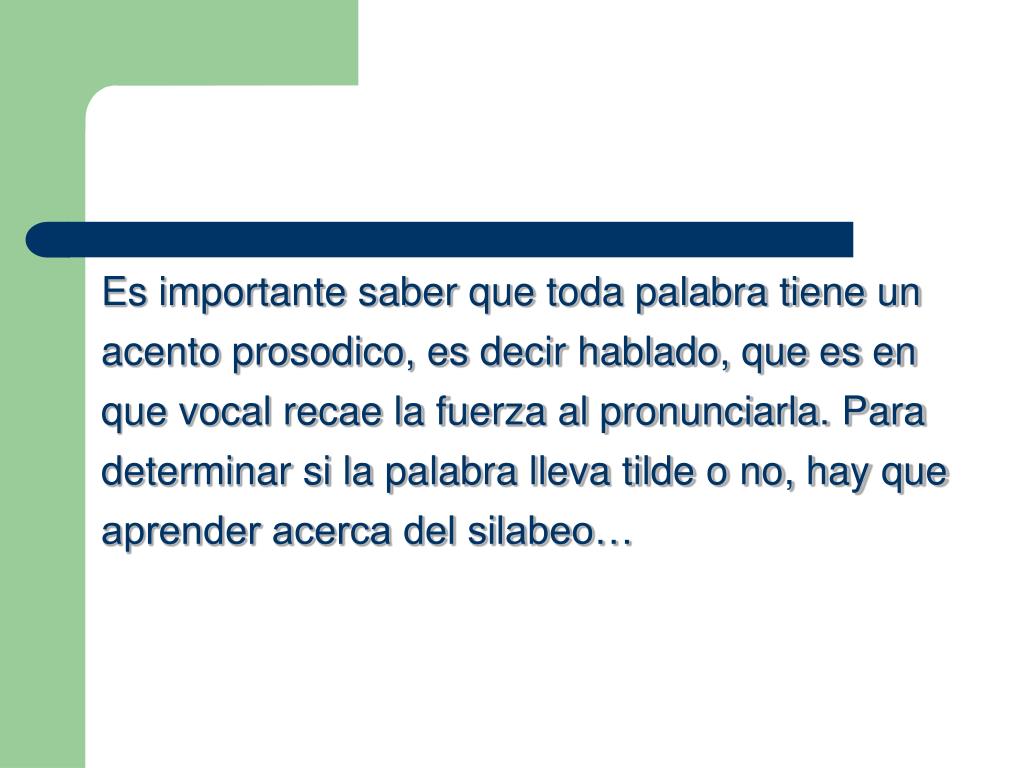 Es importante saber que toda palabra tiene un acento prosodico, es decir hablado, que es en que vocal recae la fuerza al pronunciarla. Para determinar si la palabra lleva tilde o no, hay que aprender acerca del silabeo…