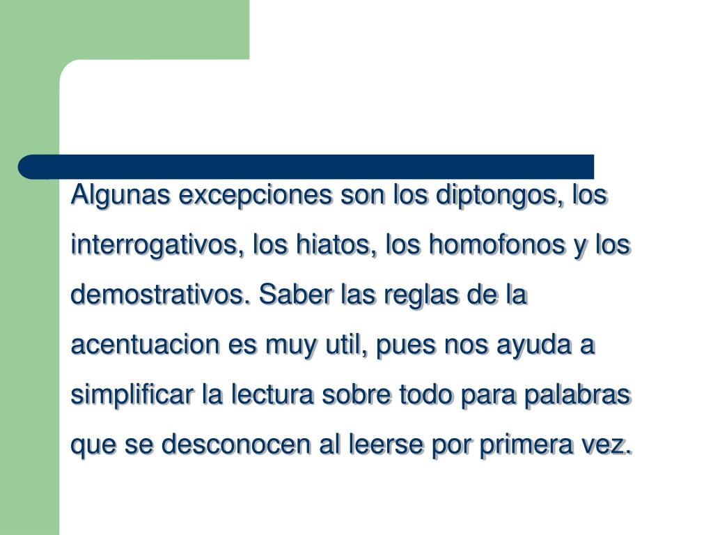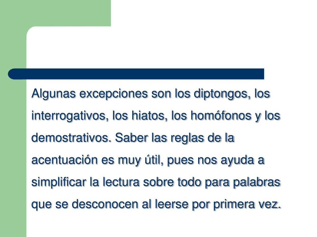 Algunas excepciones son los diptongos, los interrogativos, los hiatos, los homofonos y los demostrativos. Saber las reglas de la acentuacion es muy util, pues nos ayuda a simplificar la lectura sobre todo para palabras que se desconocen al leerse por primera vez.