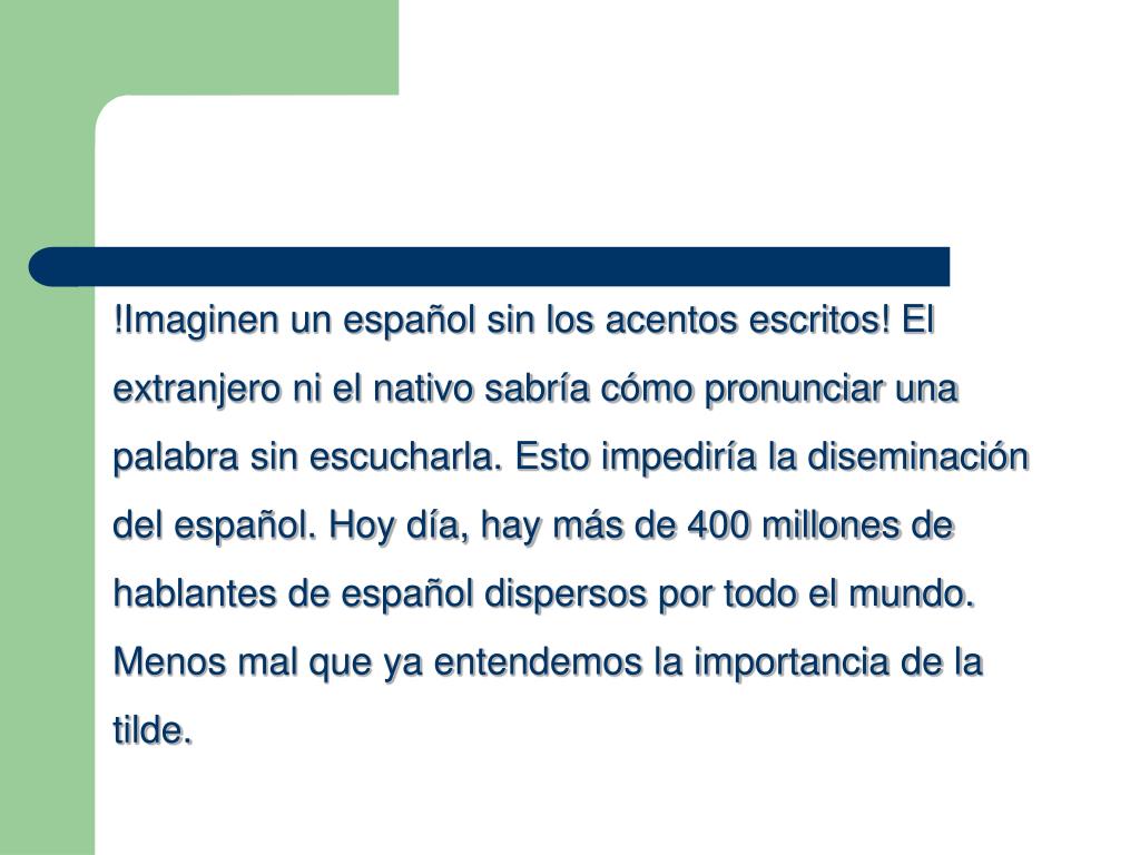 !Imaginen un español sin los acentos escritos! El extranjero ni el nativo sabría cómo pronunciar una palabra sin escucharla. Esto impediría la diseminación del español. Hoy día, hay más de 400 millones de hablantes de español dispersos por todo el mundo. Menos mal que ya entendemos la importancia de la tilde.