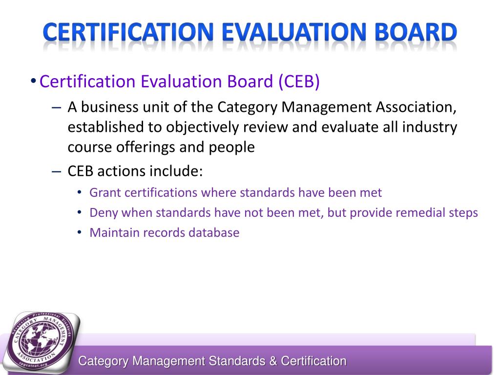 Certification Evaluation Board • Certification Evaluation Board (CEB) • A business unit of the Category Management Association, established to objectively review and evaluate all industry course offerings and people • CEB actions include: • Grant certifications where standards have been met • Deny when standards have not been met, but provide remedial steps • Maintain records database