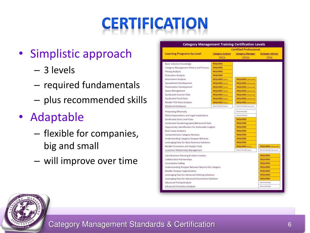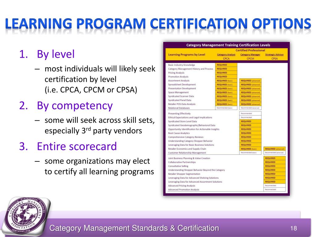 Certifications Levels for individuals • Certified Professional Category Analyst • (CPCA) • Certified Professional Strategic Advisor • (CPSA) • Certified Professional Category Manager • (CPCM)
