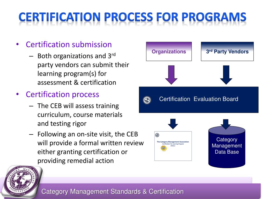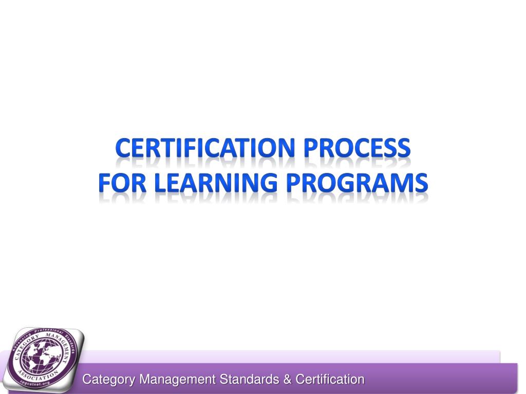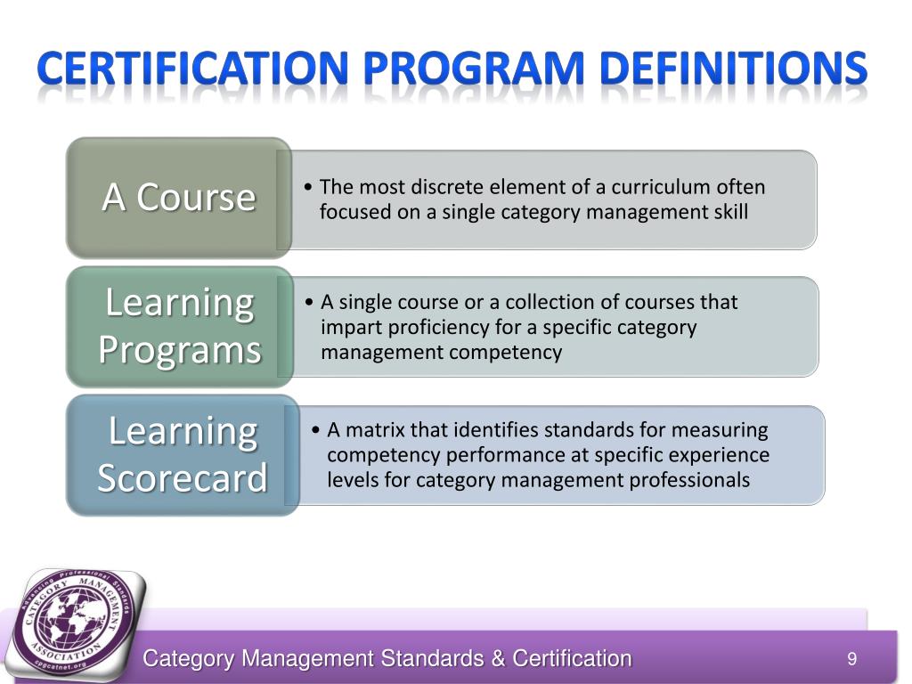 certification process for Programs • Certification submission • Both organizations and 3rd party vendors can submit their learning program(s) for assessment & certification • Certification process • The CEB will assess training curriculum, course materials and testing rigor • Following an on-site visit, the CEB will provide a formal written review either granting certification or providing remedial action Organizations 3rd Party Vendors Certification Evaluation Board Category Management Data Base