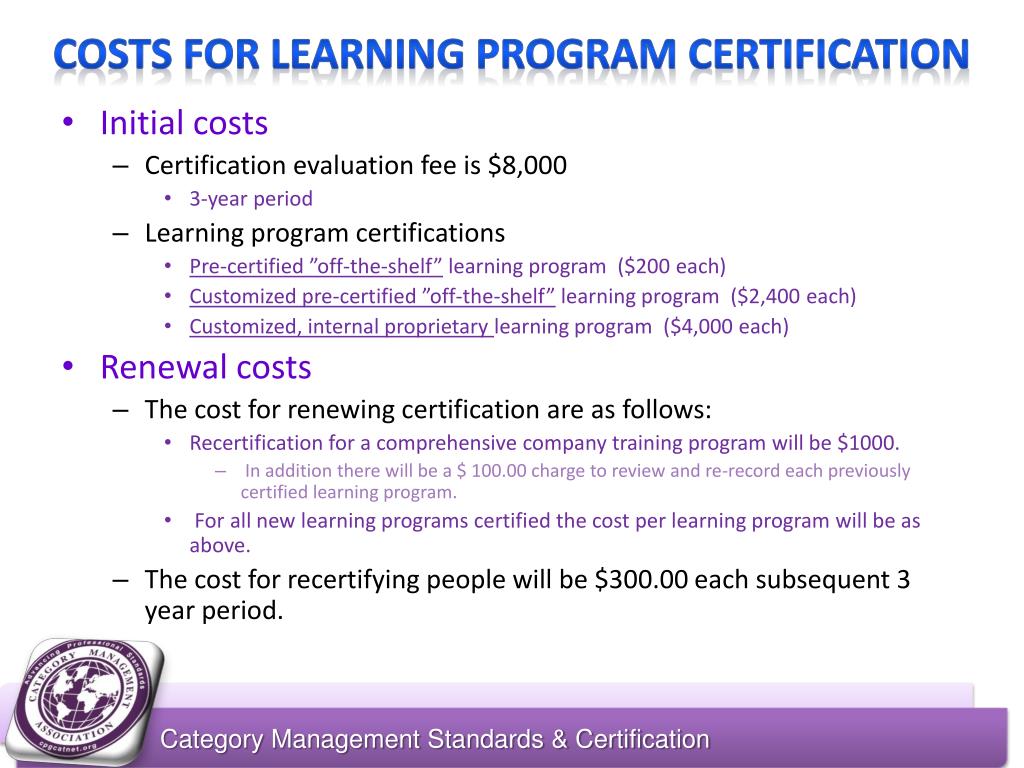 costs for Learning PROGRAM CERTIFICATION • Initial costs • Certification evaluation fee is $8,000 • 3-year period • Learning program certifications • Pre-certified ”off-the-shelf” learning program ($200 each) • Customized pre-certified ”off-the-shelf” learning program ($2,400 each) • Customized, internal proprietary learning program ($4,000 each) • Renewal costs • The cost for renewing certification are as follows: • Recertification for a comprehensive company training program will be $1000. • In addition there will be a $ 100.00 charge to review and re-record each previously certified learning program. • For all new learning programs certified the cost per learning program will be as above. • The cost for recertifying people will be $300.00 each subsequent 3 year period.