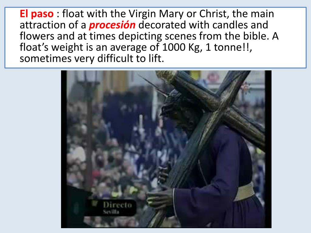 El paso: float with the Virgin Mary or Christ, the main attraction of a procesión decorated with candles and flowers and at times depicting scenes from the bible. A float’s weight is an average of 1000 Kg, 1 tonne!!, sometimes very difficult to lift.