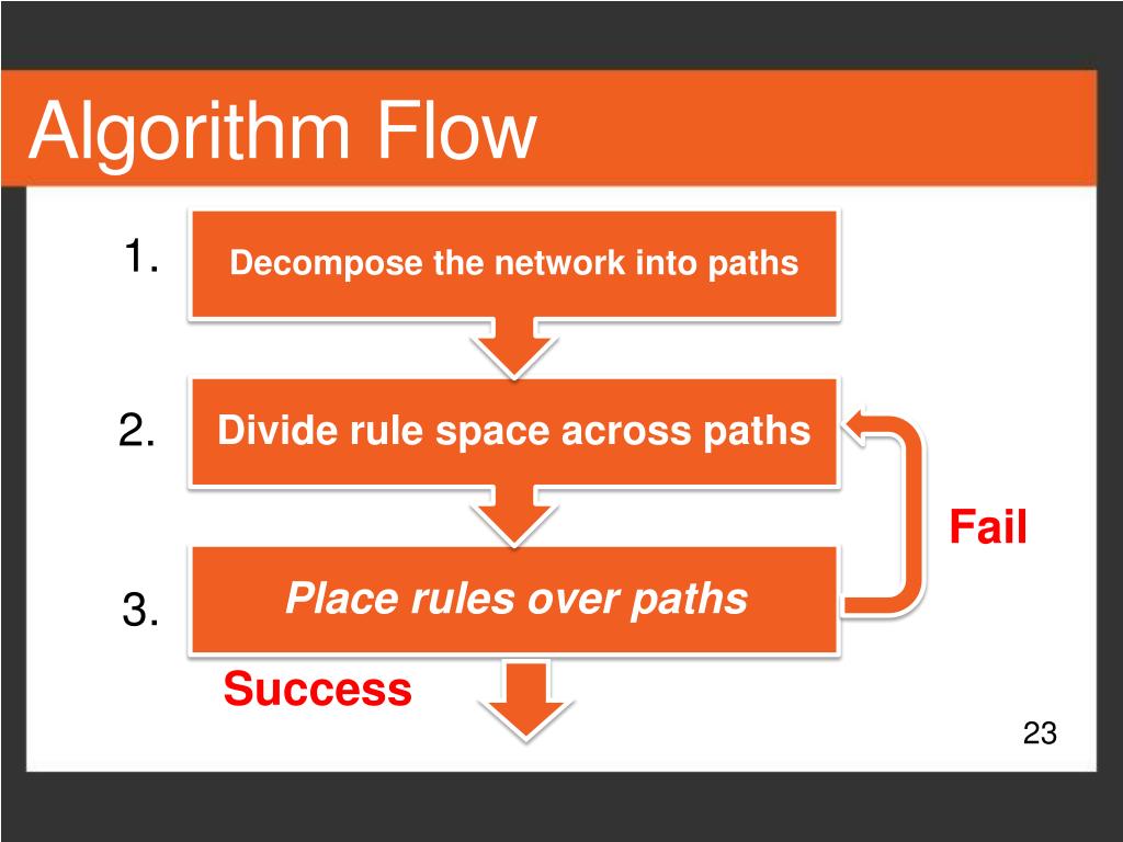 What is next step ? H2 H1 H3 ? • Divide rule space across paths • Estimate the rules needed by each path • Partition rule space by Linear Programming ✔ ✔ Decomposition to paths Solve rule placement over paths 22