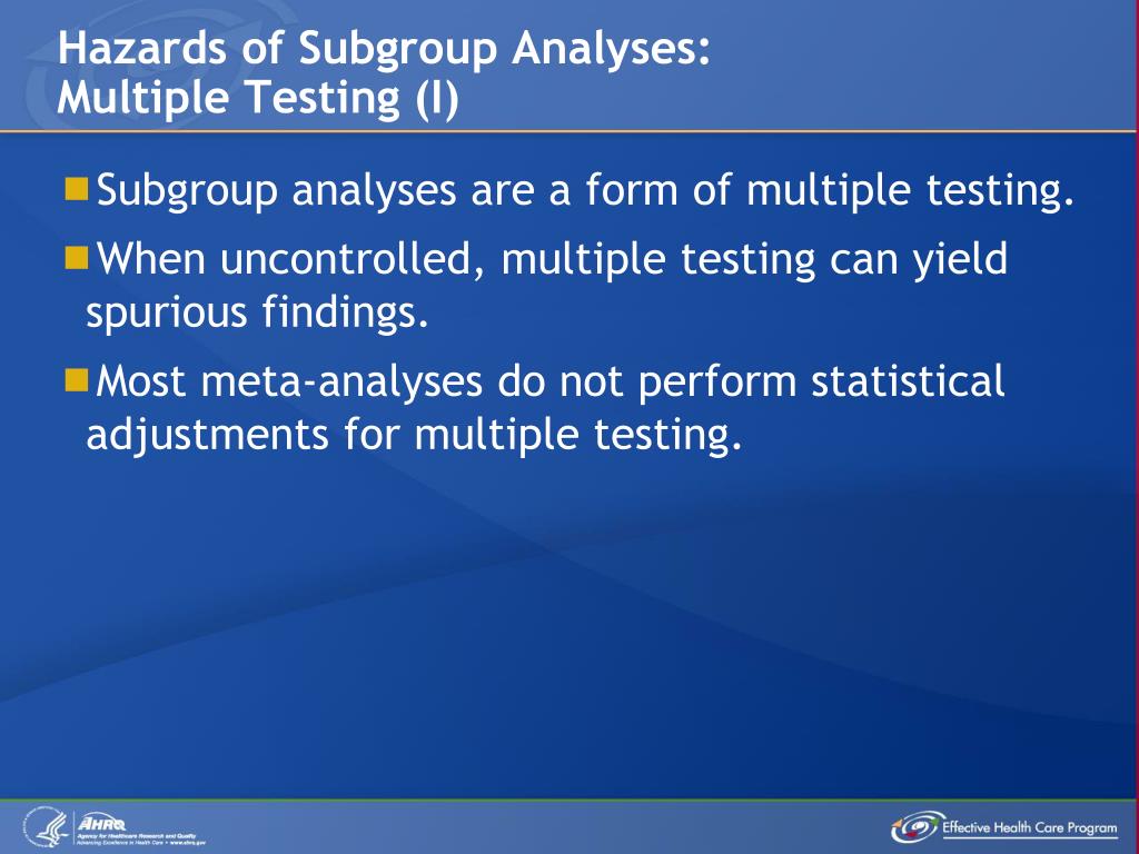 Hazards of Subgroup Analyses:Multiple Testing (I) • Subgroup analyses are a form of multiple testing. • When uncontrolled, multiple testing can yield spurious findings. • Most meta-analyses do not perform statistical adjustments for multiple testing.