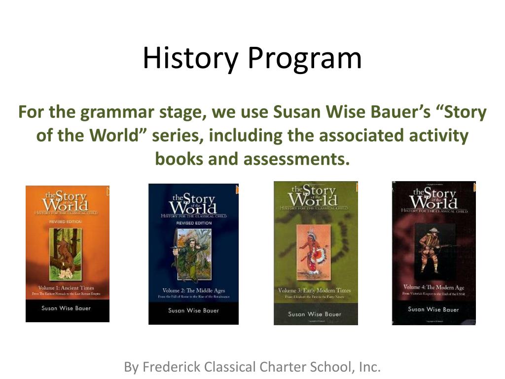 History Program For the grammar stage, we use Susan Wise Bauer’s “Story of the World” series, including the associated activity books and assessments.