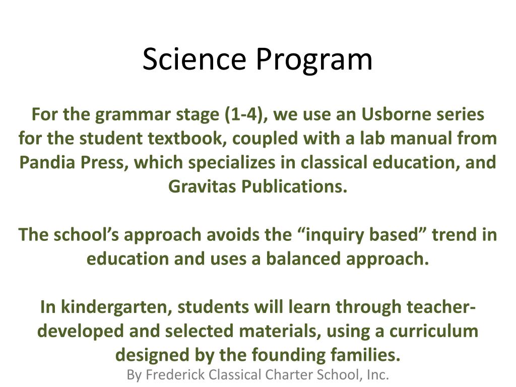 Science Program For the grammar stage (1-4), we use an Usborne series for the student textbook, coupled with a lab manual from Pandia Press, which specializes in classical education, and Gravitas Publications. The school’s approach avoids the “inquiry based” trend in education and uses a balanced approach. In kindergarten, students will learn through teacher-developed and selected materials, using a curriculum designed by the founding families.