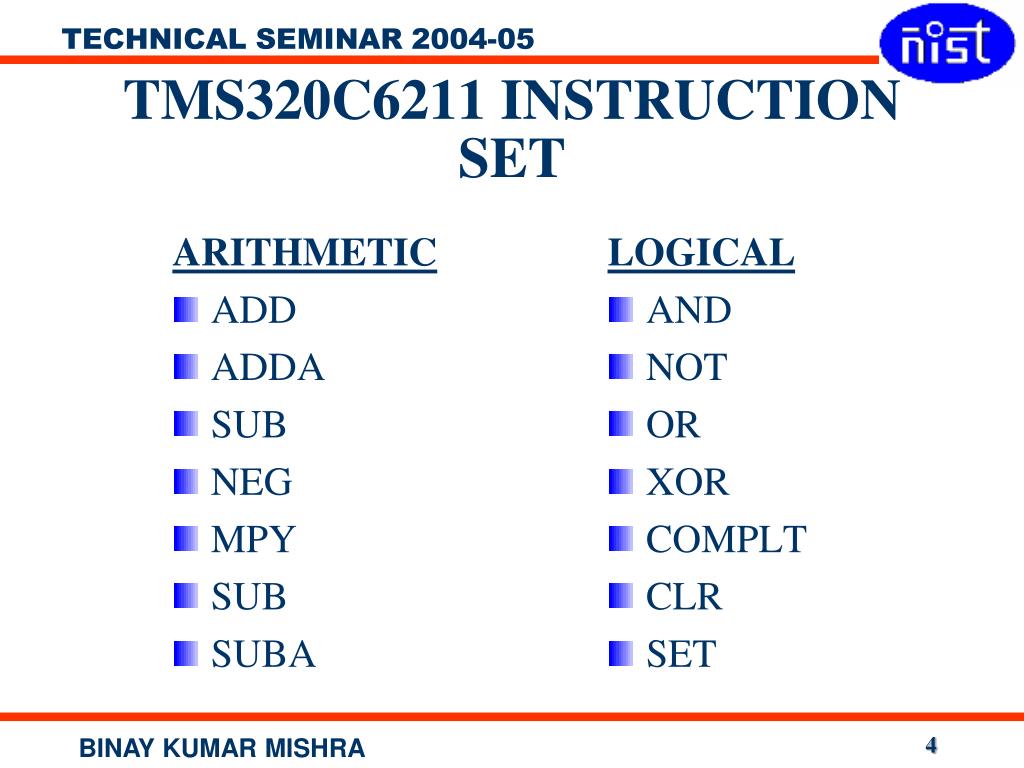 ARITHMETIC ADD ADDA SUB NEG MPY SUB SUBA LOGICAL AND NOT OR XOR COMPLT CLR SET TMS320C6211 INSTRUCTION SET