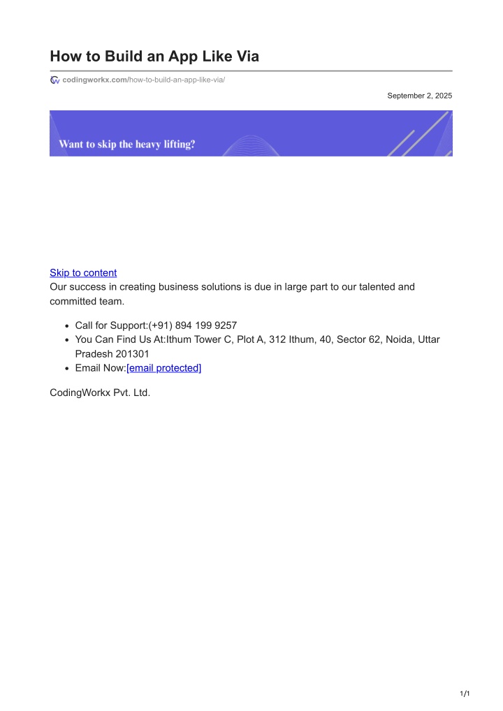 How to Build an App Like Via codingworkx.com/how-to-build-an-app-like-via/ September 2, 2025 Skip to content Our success in creating business solutions is due in large part to our talented and committed team. Call for Support:(+91) 894 199 9257 You Can Find Us At:Ithum Tower C, Plot A, 312 Ithum, 40, Sector 62, Noida, Uttar Pradesh 201301 Email Now:[email protected] CodingWorkx Pvt. Ltd. 1/1