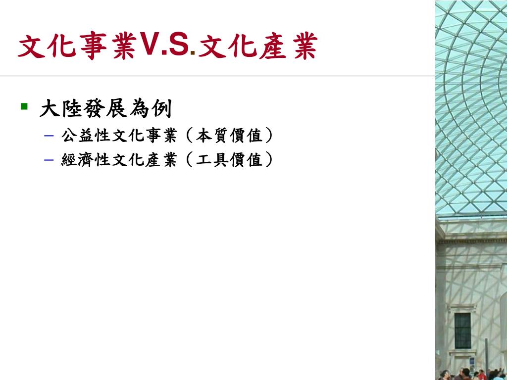 文化事業V.S.文化產業 • 大陸發展為例 • 公益性文化事業(本質價值) • 經濟性文化產業(工具價值)