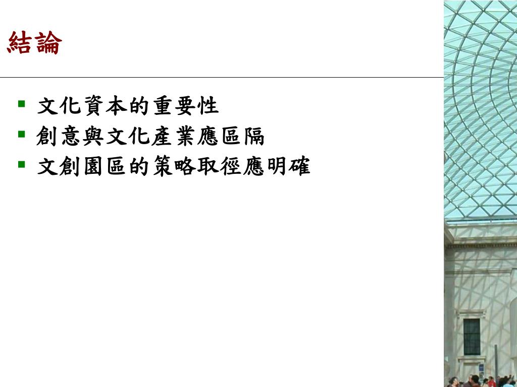 結論 • 文化資本的重要性 • 創意與文化產業應區隔 • 文創園區的策略取徑應明確