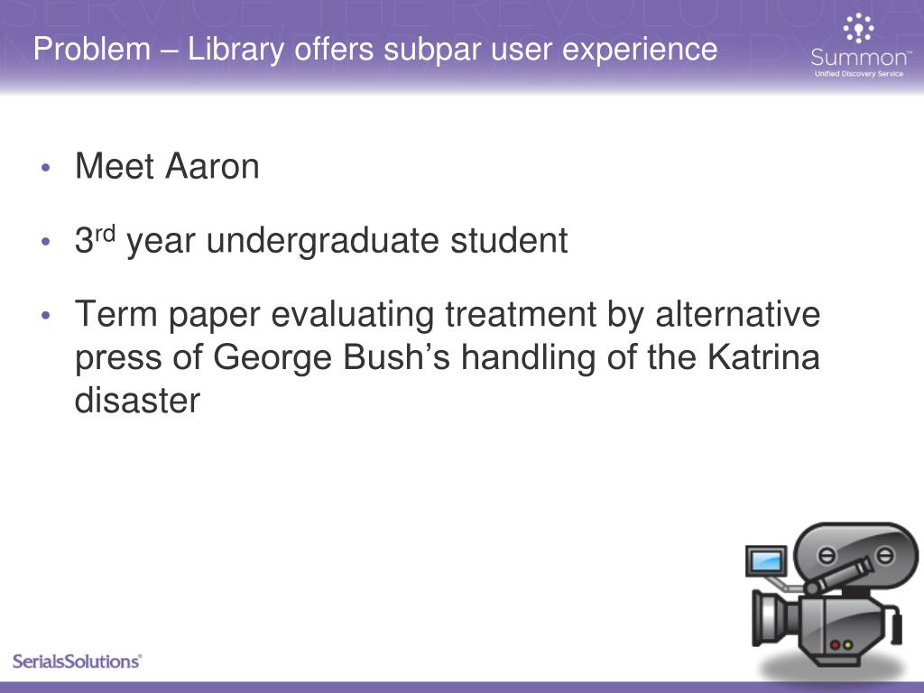 Problem – Library offers subpar user experience • Meet Aaron • 3rd year undergraduate student • Term paper evaluating treatment by alternative press of George Bush’s handling of the Katrina disaster