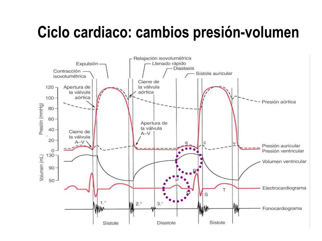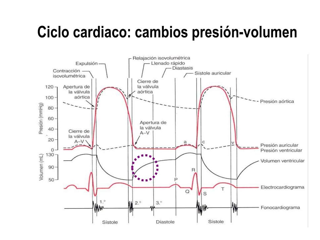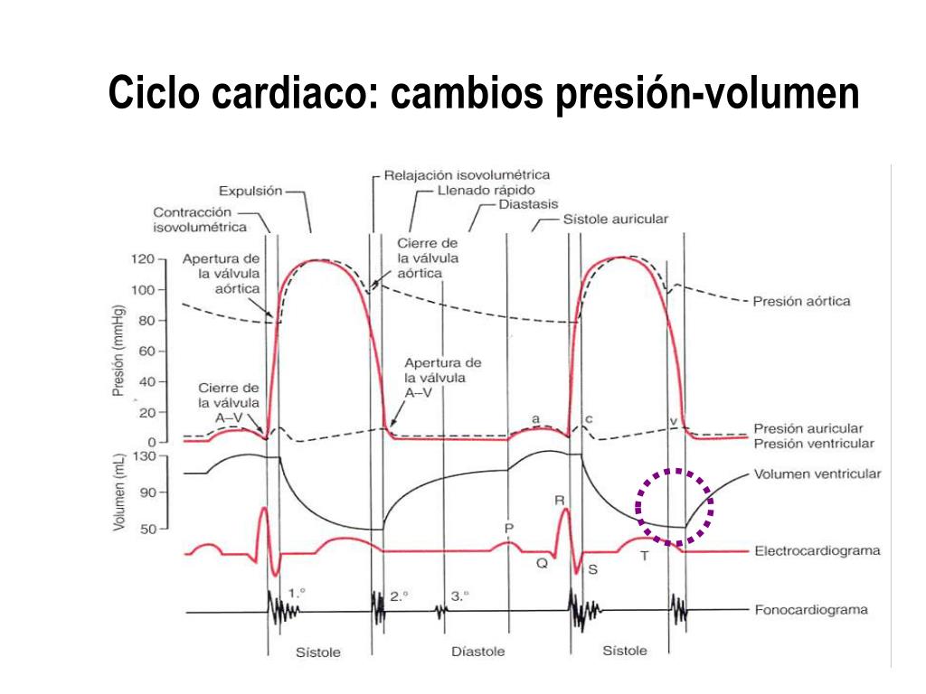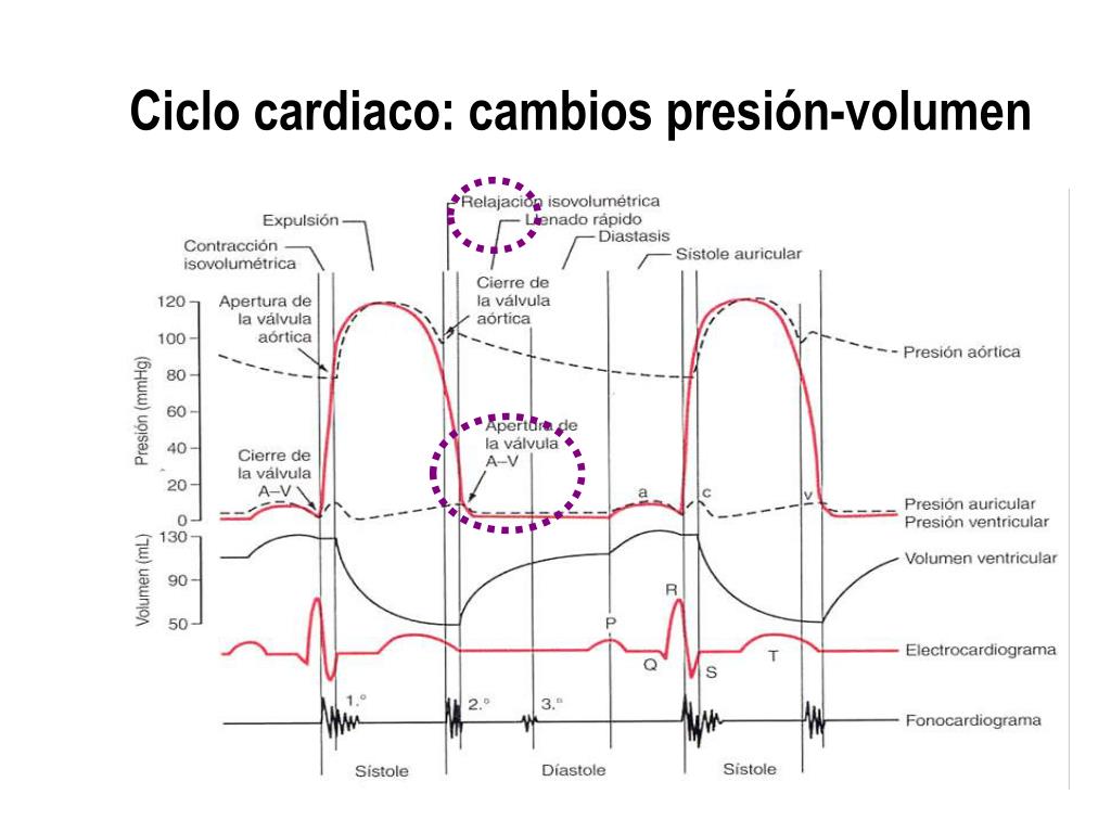 Ciclo cardiaco: Diástole (relajación isovolumétrica) 6. Cuando la presión en el ventrículo izquierdo cae por debajo de la presión aórtica (~80 mmHg), la presión de retroceso hace que las válvulas semilunares se cierren. En este momento, la presión en el ventrículo desciende a 0 mmHg, manteniendo un volumen mínimo (el telesistólico,~45-50 mL).