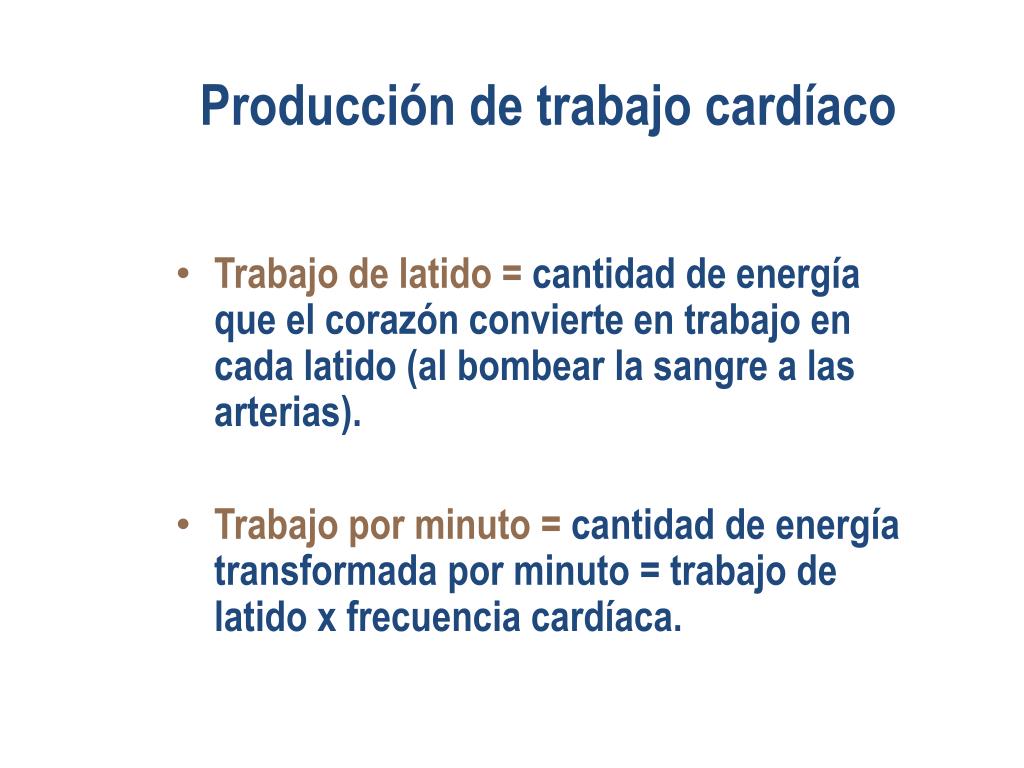 Producción de trabajo cardíaco • Trabajo de latido = cantidad de energía que el corazón convierte en trabajo en cada latido (al bombear la sangre a las arterias). • Trabajo por minuto = cantidad de energía transformada por minuto = trabajo de latido x frecuencia cardíaca.