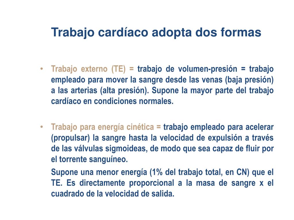 Trabajo cardíaco adopta dos formas • Trabajo externo (TE) = trabajo de volumen-presión = trabajo empleado para mover la sangre desde las venas (baja presión) a las arterias (alta presión). Supone la mayor parte del trabajo cardíaco en condiciones normales. • Trabajo para energía cinética = trabajo empleado para acelerar (propulsar) la sangre hasta la velocidad de expulsión a través de las válvulas sigmoideas, de modo que sea capaz de fluir por el torrente sanguíneo. Supone una menor energía (1% del trabajo total, en CN) que el TE. Es directamente proporcional a la masa de sangre x el cuadrado de la velocidad de salida.