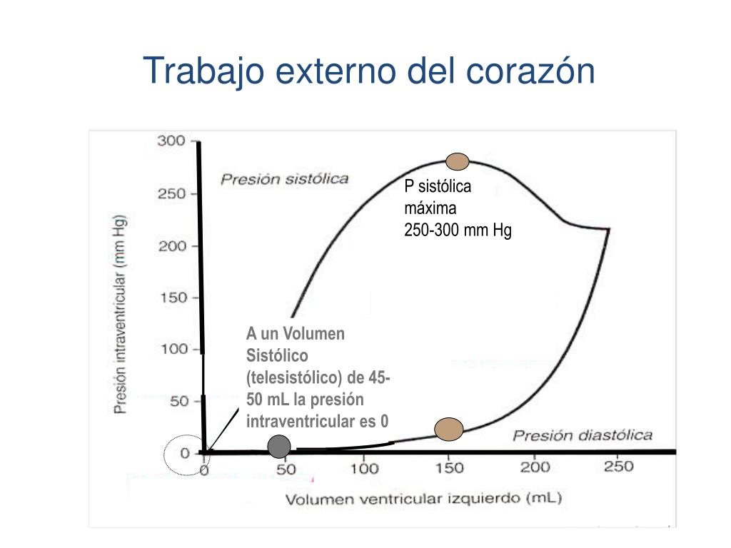 P sistólica máxima 250-300 mm Hg Si el volumen no excede los 150 mL la presión diastólica apenas aumenta Trabajo externo del corazón