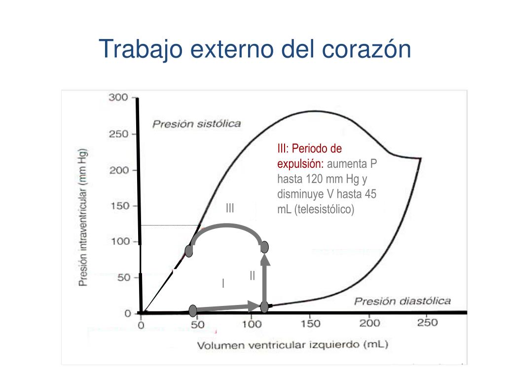 III: Periodo de expulsión: aumenta P hasta 120 mm Hg y disminuye V hasta 45 mL (telesistólico) III II I Trabajo externo del corazón