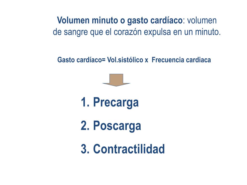 Volumen minuto o gasto cardíaco: volumen de sangre que el corazón expulsa en un minuto. Gasto cardíaco= Vol.sistólico x Frecuencia cardiaca • Precarga • Poscarga • Contractilidad