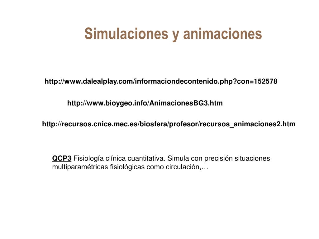 Simulaciones y animaciones http://www.dalealplay.com/informaciondecontenido.php?con=152578 http://www.bioygeo.info/AnimacionesBG3.htm http://recursos.cnice.mec.es/biosfera/profesor/recursos_animaciones2.htm QCP3 Fisiología clínica cuantitativa. Simula con precisión situaciones multiparamétricas fisiológicas como circulación,…