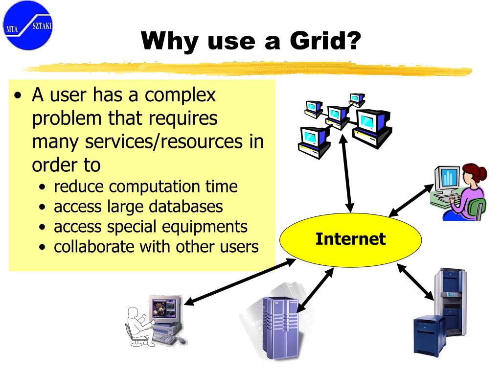 Why use a Grid? • A user has a complex problem that requires many services/resources in order to • reduce computation time • access large databases • access special equipments • collaborate with other users Internet