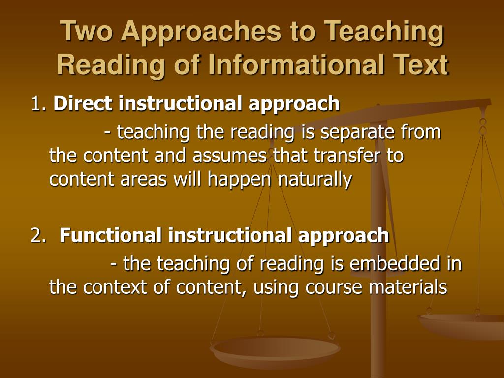 Two Approaches to Teaching Reading of Informational Text 1. Direct instructional approach - teaching the reading is separate from the content and assumes that transfer to content areas will happen naturally 2. Functional instructional approach - the teaching of reading is embedded in the context of content, using course materials