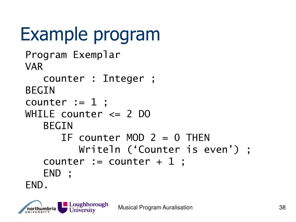 Example program Program Exemplar VAR counter : Integer ; BEGIN counter := 1 ; WHILE counter <= 2 DO BEGIN IF counter MOD 2 = 0 THEN Writeln (‘Counter is even’) ; counter := counter + 1 ; END ; END. Musical Program Auralisation