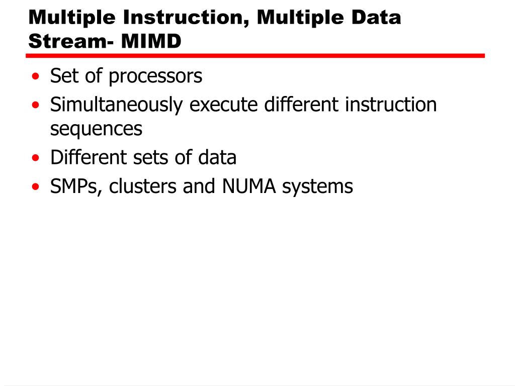 Multiple Instruction, Multiple Data Stream- MIMD • Set of processors • Simultaneously execute different instruction sequences • Different sets of data • SMPs, clusters and NUMA systems