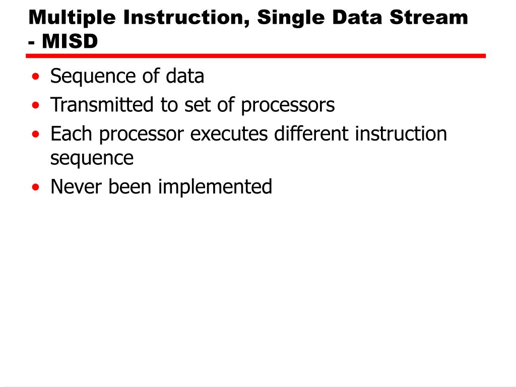 Multiple Instruction, Single Data Stream - MISD • Sequence of data • Transmitted to set of processors • Each processor executes different instruction sequence • Never been implemented