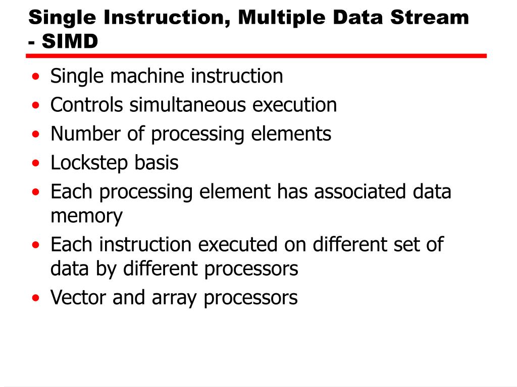 Single Instruction, Multiple Data Stream - SIMD • Single machine instruction • Controls simultaneous execution • Number of processing elements • Lockstep basis • Each processing element has associated data memory • Each instruction executed on different set of data by different processors • Vector and array processors