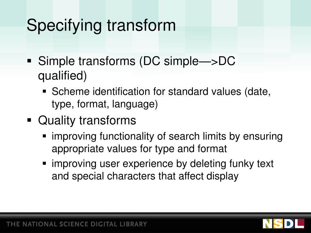 Specifying transform • Simple transforms (DC simple—>DC qualified) • Scheme identification for standard values (date, type, format, language) • Quality transforms • improving functionality of search limits by ensuring appropriate values for type and format • improving user experience by deleting funky text and special characters that affect display