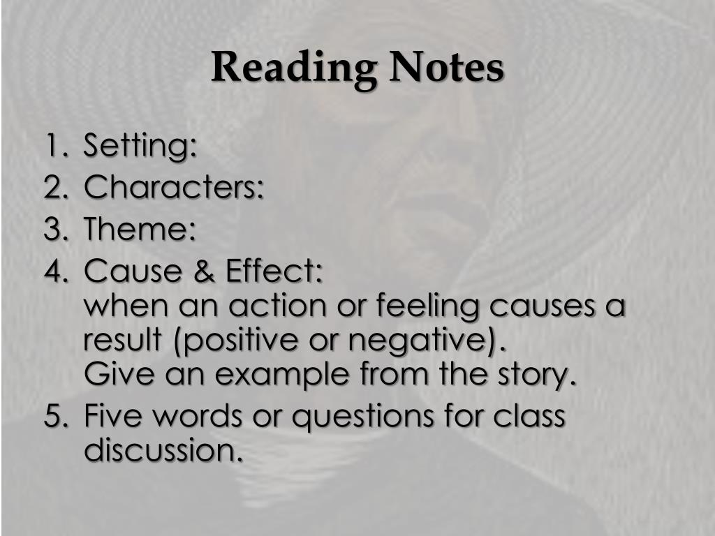 Reading Notes • Setting: • Characters: • Theme: • Cause & Effect: when an action or feeling causes a result (positive or negative). Give an example from the story. • Five words or questions for class discussion.
