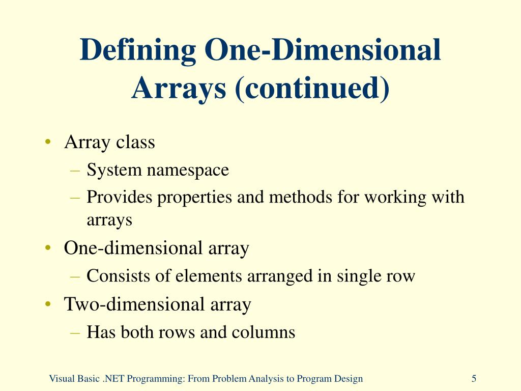 Defining One-Dimensional Arrays (continued) • Arrays • Elements must have same data type • Access individual elements in array using index • Can be one- or multi-dimensional Visual Basic .NET Programming: From Problem Analysis to Program Design