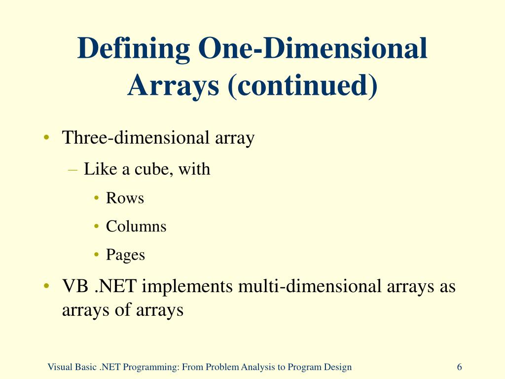 Defining One-Dimensional Arrays (continued) • Three-dimensional array • Like a cube, with • Rows • Columns • Pages • VB .NET implements multi-dimensional arrays as arrays of arrays Visual Basic .NET Programming: From Problem Analysis to Program Design