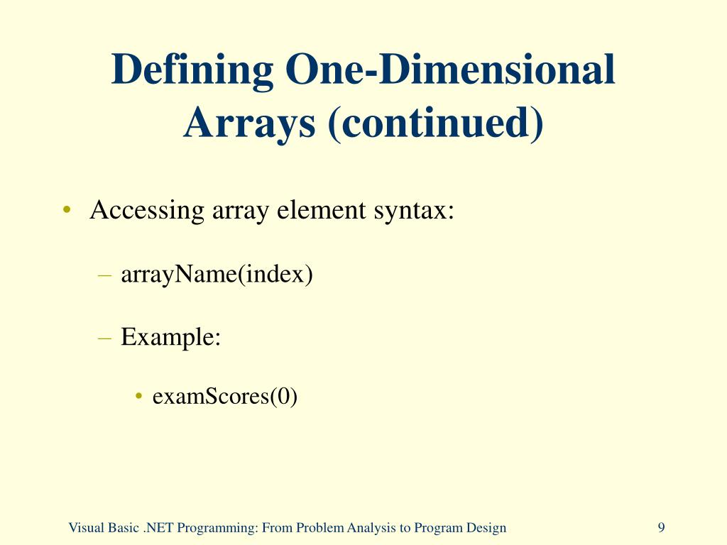 Defining One-Dimensional Arrays (continued) • Accessing array element syntax: • arrayName(index) • Example: • examScores(0) Visual Basic .NET Programming: From Problem Analysis to Program Design