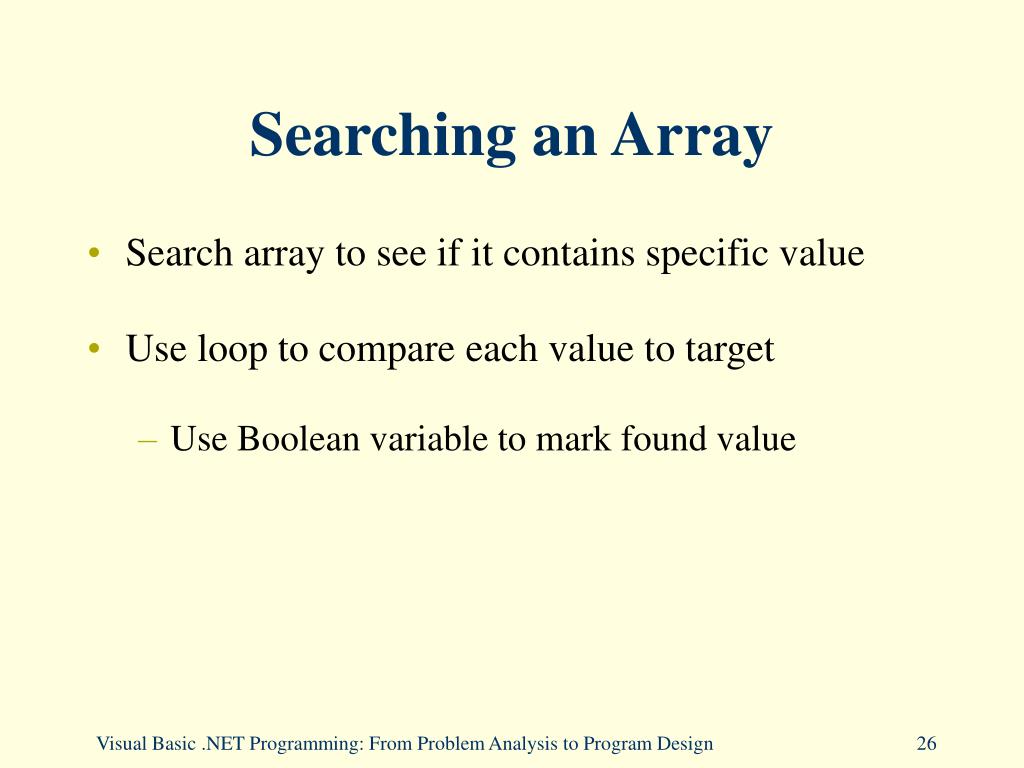 Searching an Array • Search array to see if it contains specific value • Use loop to compare each value to target • Use Boolean variable to mark found value Visual Basic .NET Programming: From Problem Analysis to Program Design