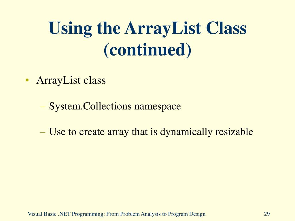 Using the ArrayList Class (continued) • ArrayList class • System.Collections namespace • Use to create array that is dynamically resizable Visual Basic .NET Programming: From Problem Analysis to Program Design