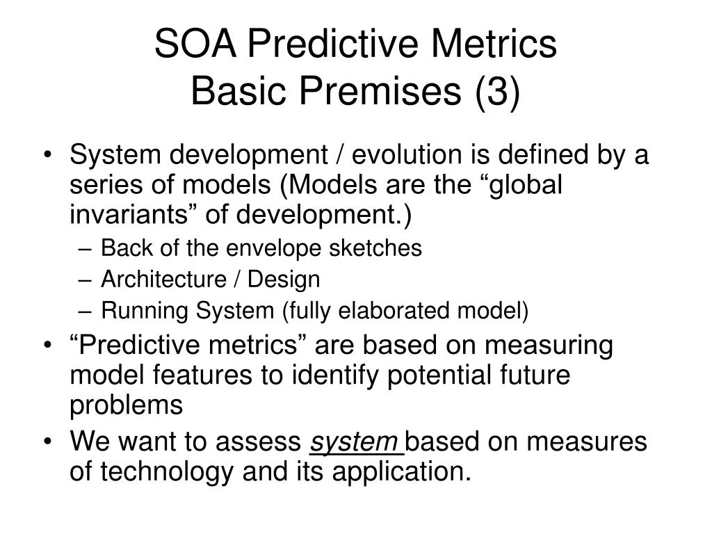 SOA Predictive Metrics Basic Premises (1) • System development / evolution is defined by a series of models (Models are the “global invariants” of development.) • Back of the envelope sketches • Architecture / Design • Running System (fully elaborated model) • “Predictive metrics” are based on measuring model features to identify potential future problems